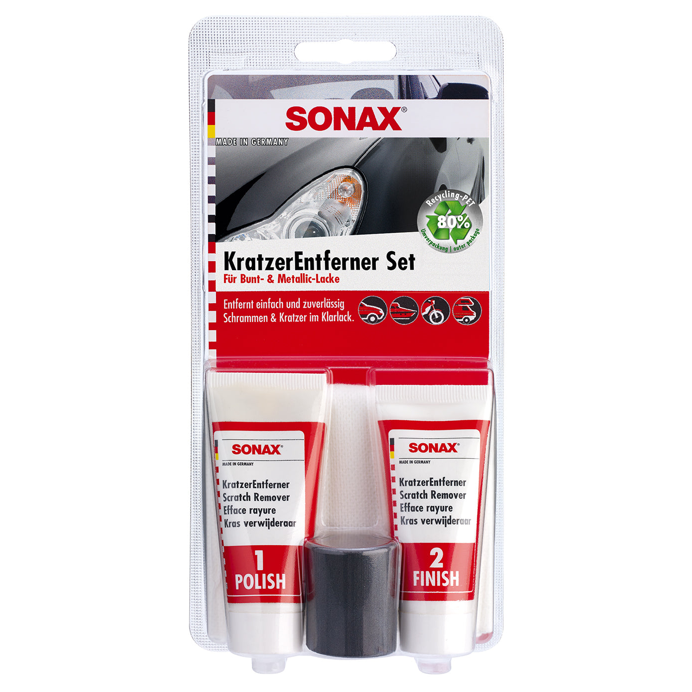 Polishing set for manually removing localized scratches and grazes from paintwork clear coat. In just 2 - 3 easy steps even deep scratches can be removed, provided that they do not extend into the base coat or undercoat. For standard, metallic and scratch resistant paints.