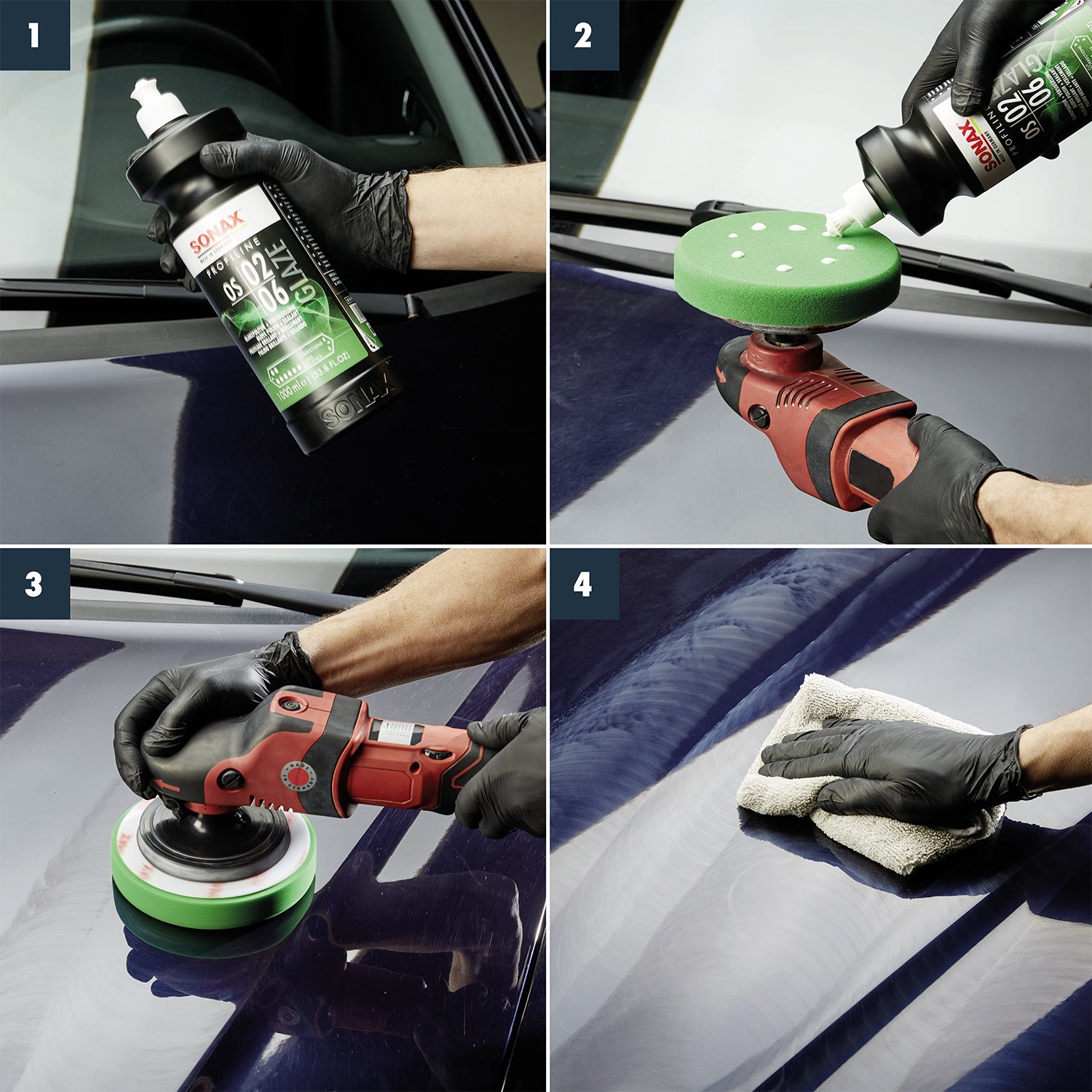 Shake bottle before use. Application with rotary polishing machine: Apply product to a Foam Pad medium (04930000 or 0498541) and process at low to medium speed. Application with orbital polishing machine: Apply product to the Orbital Polishing Pad medium (04933410 or 04935000) and process at medium to high speed. Regularly clean polishing pads. Never use different polishes on one pad. Do not use on hot surfaces.