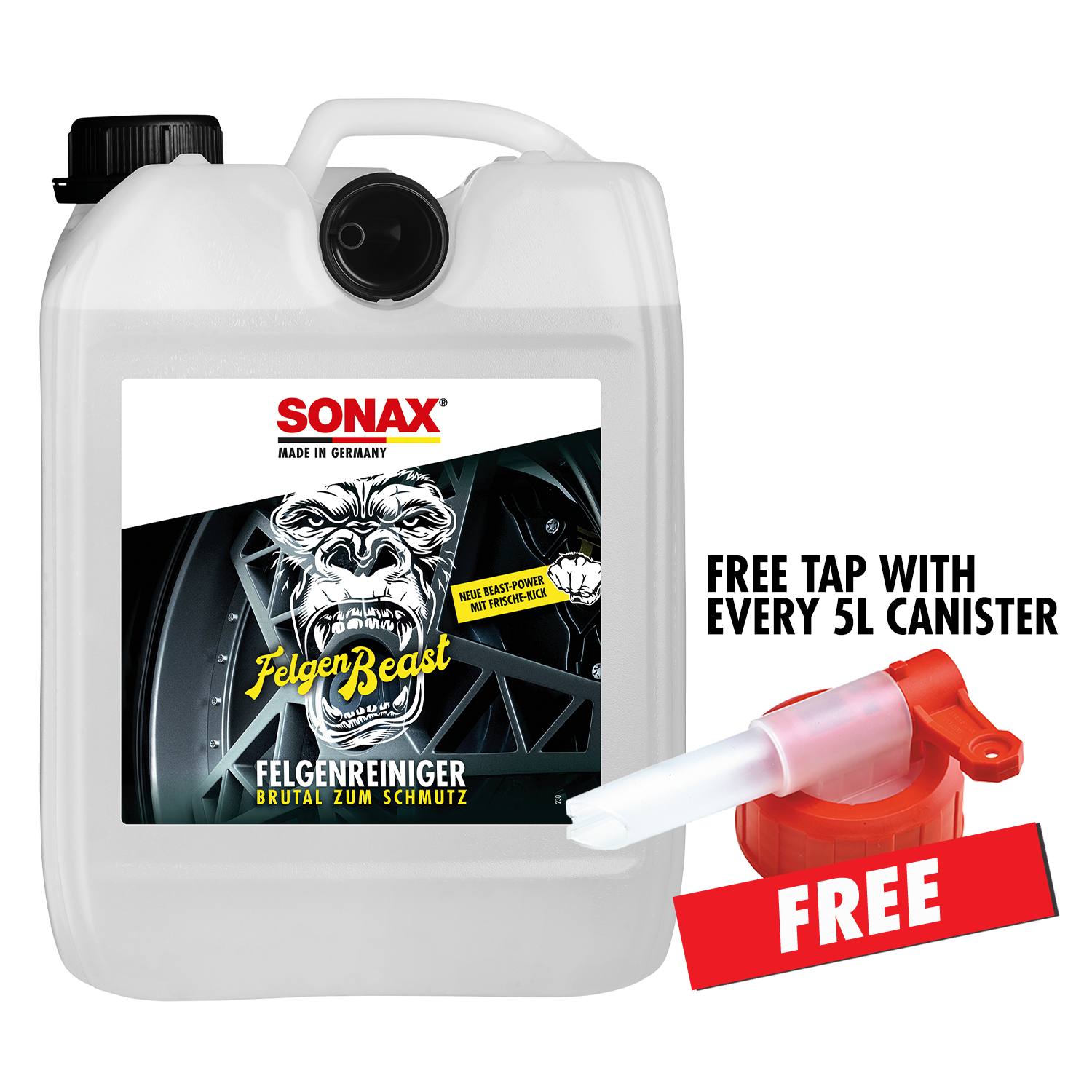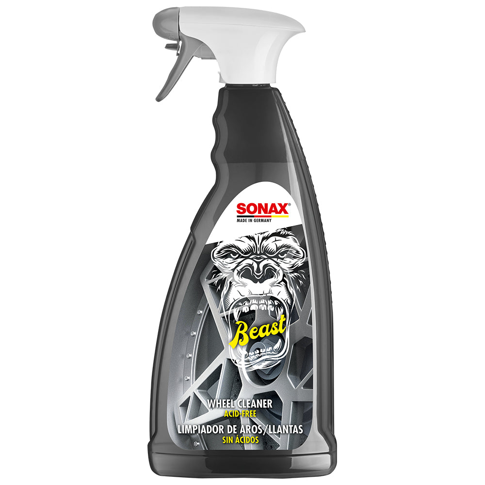 SONAX Wheel Beast Cleaner. The SONAX Beast just gives dirt no chance! For all steel and light alloy wheel rims + lacquered, chromed, polished and matt wheel rims. Removes even the beastliest dirt contamination. The SONAX Beast turns a reddish colour and displays to the full its cleaning powers. Especially material compatible, does not attack the wheel rim surfaces or wheel studs. Suitable for wheels with tyre pressure control systems.